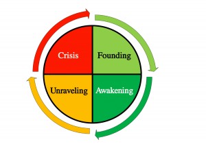According to The Fourth Turning history proceeds in cycles of about 80 years and can be divided into four phases. So, in the US the four phases are like the seasons of the year: a spring-like “high” (postwar America), the summer awakening and spirituality (the 1960s), autumnal alienation (the Reagan era), and finally the wintery crisis that is a transformational event that sweeps out the old order. There is more to the theory along with other cycles but I think you get the point. Strauss and Howe are still chasing the dream of finding a complete scientific theory of history when, in fact, modern historians are more micro then they are macro with respect to the artifacts of history and what they mean.